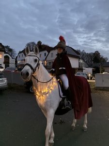Sankt Martin war wieder eine Frau. Sie ritt auf einem großen Pferd und hatte sogar ein kleines Pony dabei. Beide waren mit Lichterketten geschmückt.
