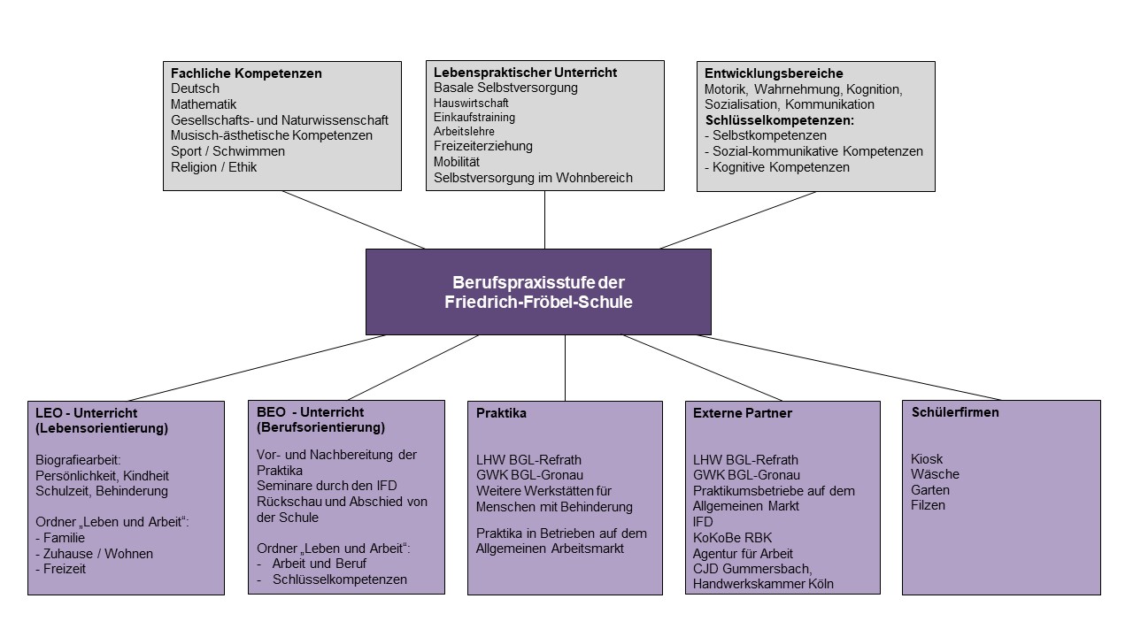 Während ihrer zweijährigen Berufspraxisstufen-Zeit erfüllen die Schüler*innen mit dem Förderschwerpunkt Geistige Entwicklung ihre Berufsschulpflicht. In verschiedenen Lern- und Arbeitsformen werden die Schüler*innen auf das Leben als Erwachsene in verschiedenen Lebensbereichen vorbereitet – insbesondere auf die Arbeitswelt.